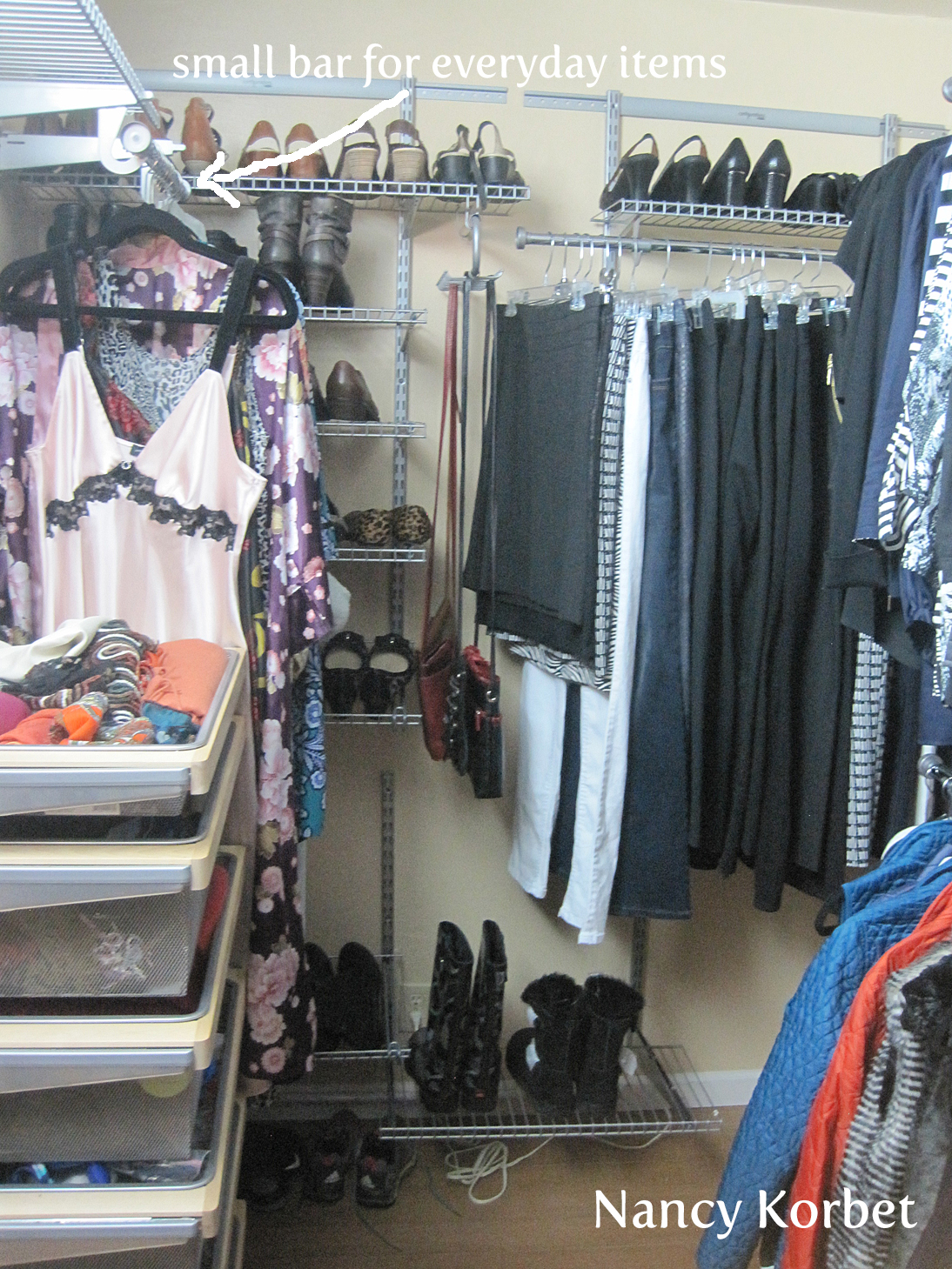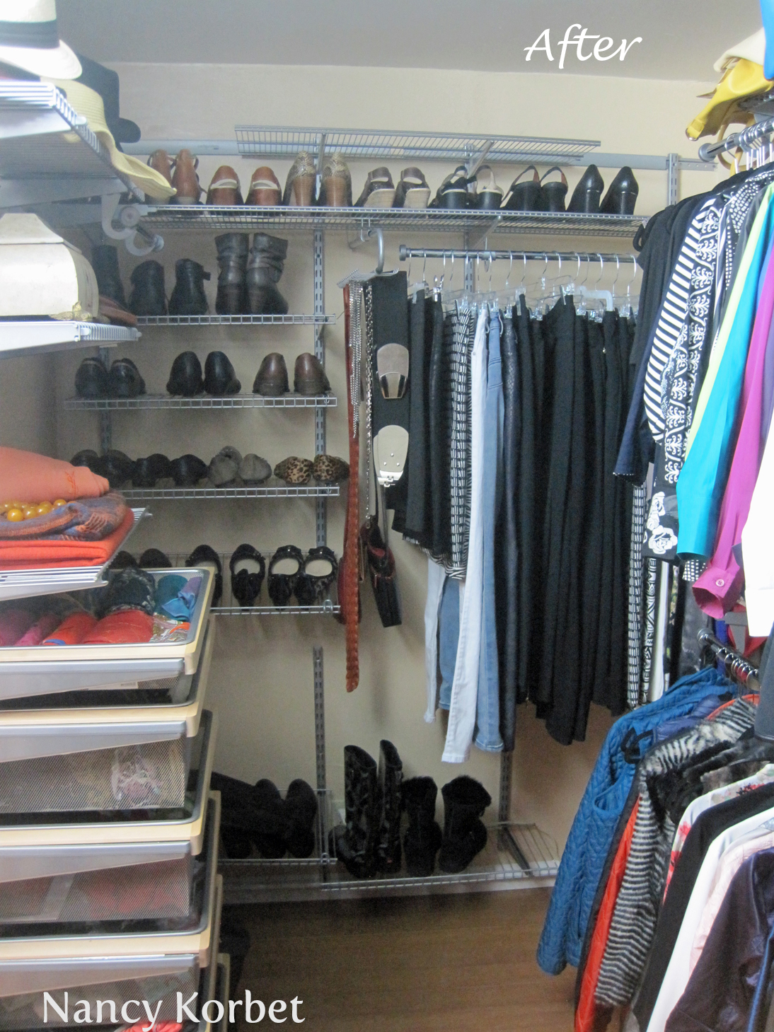 CLOSET ORGANIZING SYSTEMS are fairly easy to install, are space saving and depending on which ones you choose, quite flexible. My client already had the Elfa Shelving System (30% off sale thru 2/15/16). I re-positioned the existing shelves and bars for her current needs. I even gave her a small hanging space for her nightgowns and robes, so she could easily access them.
